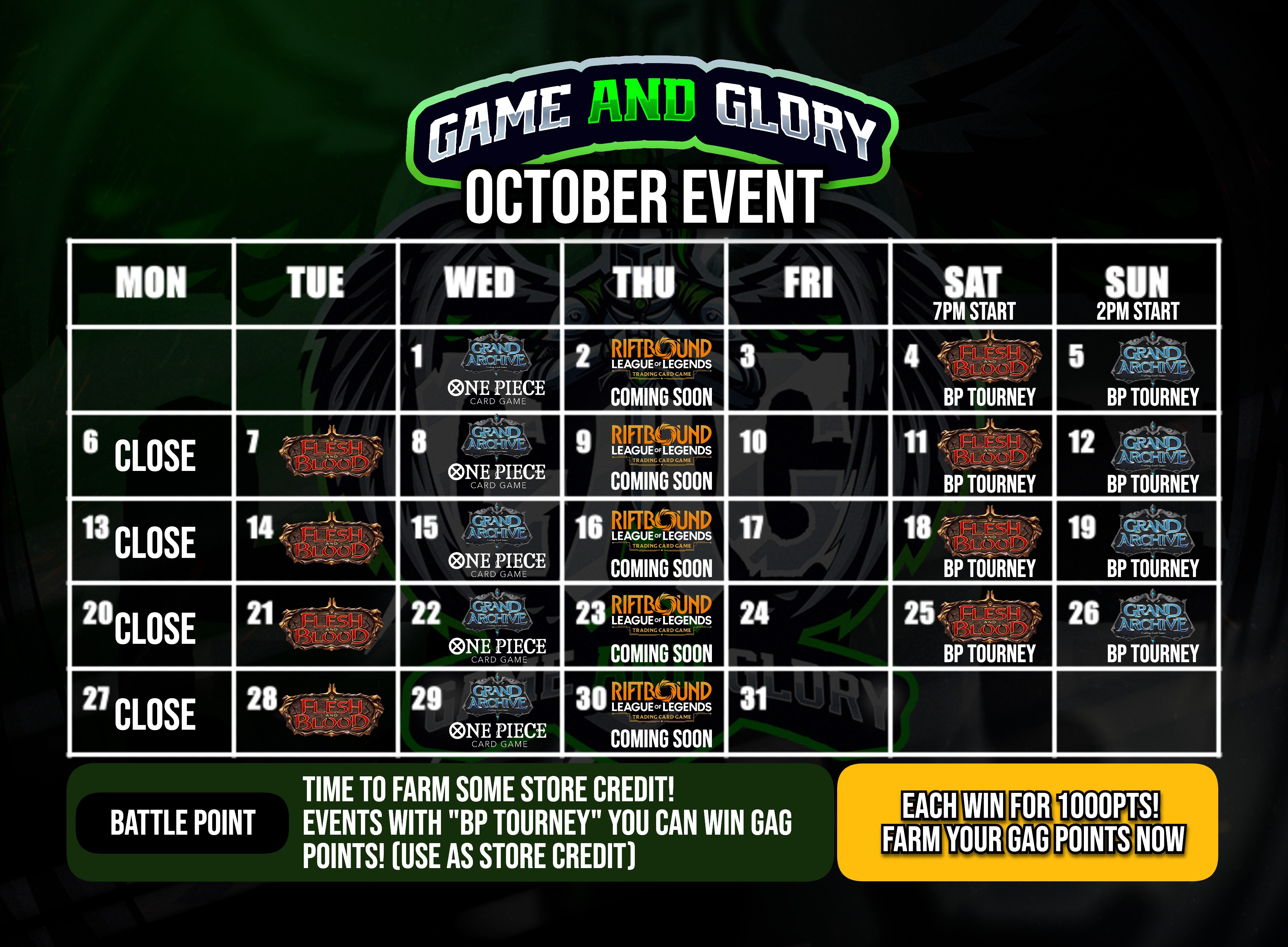 At GAG, we take Flesh and Blood seriously. We host regular Learn to Play sessions and competitive tournaments — including Classic Constructed and Blitz formats.